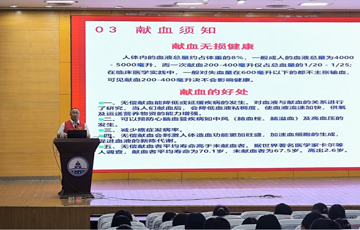 会上,卢桂吉致辞并鼓励同学们科学献血。邹荣华讲师为我们带来了一场关于无偿献血知识的精彩讲座。并与参会人员互动,解答大家心中的疑惑,呼吁大家积极参与到无偿献血行列中来。
