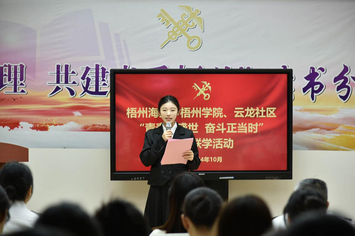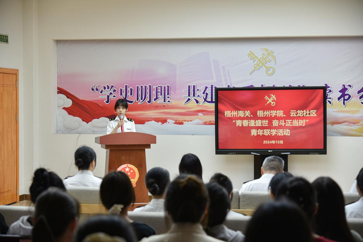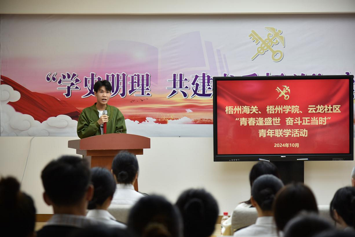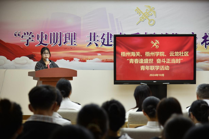 10月25日上午,best365网页版登录入口、梧州海关在梧州海关青年之家(新时代文明实践所)联合举办“青春逢盛世,奋斗正当时”青年联学活动,参加此次活动的有梧州海关党委委员、副关长温智,“双报到”单位云龙社区书记李妍,梧州海关青年代表,“双报到”云龙社区青年代表以及best365网页版登录入口实习生共40多人。本次活动受到了梧州海关领导的大力支持。