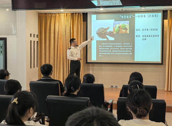 在讲座中,梧州海关植物检疫专家姬佳旗同志为实习生们详细讲解了松材线虫、非洲大蜗牛、红火蚁、红耳龟(即巴西龟)、食人鲳(即食人鱼)、凤眼莲(即水葫芦)等外来有害生物的基本情况,包括它们的形态特征、生活习性、传播方式及可能带来的疾病风险。在细致而全面的讲解下,实习生们深刻理解到了生物入侵的复杂性和它对农业、林业、畜牧业和渔业造成的经济影响,以及对人类健康的潜在威胁。