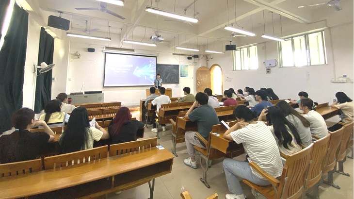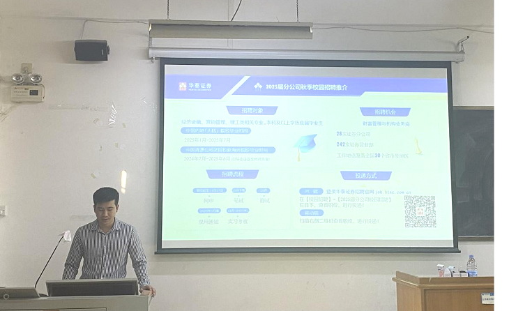 11月11日下午,华泰证券股份有限公司梧州西堤三路证券营业部在明理楼中楼504教室开展2025届毕业生就业宣讲会。总经理覃舒闽、综合部主任韦武秋一行、best365网页版登录入口毕业班辅导员谢兵、2025届国际经济与贸易、电子商务和金融工程专业毕业生参加就业宣讲会。