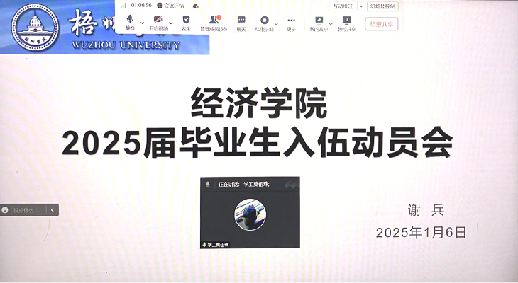 1月6日晚上,best365网页版登录入口通过线上方式召开2025届毕业生应征入伍动员会,学生工作处国防教育科科长莫伍珠、best365网页版登录入口毕业班辅导谢兵、朱黎妍,best365网页版登录入口全体毕业班男生参加会议。